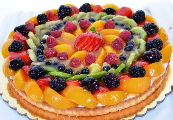 This “Fruit Tart Galore” is an absolute work of art!A flakey shell, brimming with a rich cream filling is topped by several rings of glazed and fresh fruit.Generous slices of peach, strawberries, and kiwis are adroitly positioned in concentric rings, then complemented by blackberries, raspberries, and blueberries, resting lightly on top.Tempting, colorful, and scrumptious, this is a most excellent selection for any occasion.