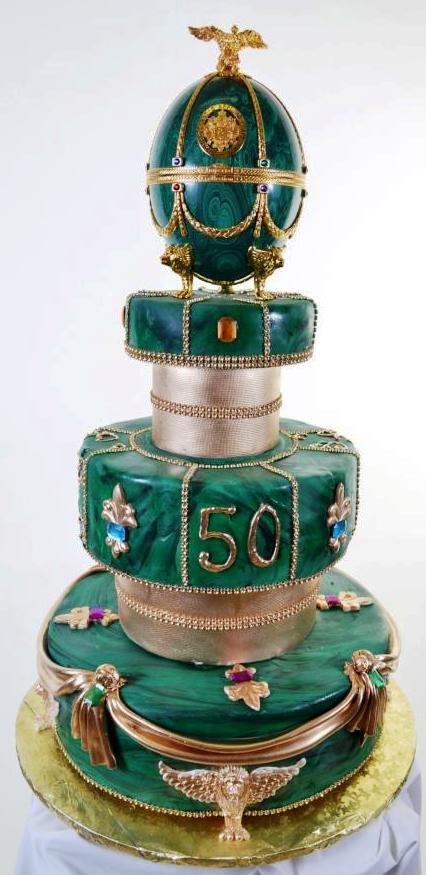 “Faberge”:the name says it all.Often imitated, but never equaled, this jeweler to the House of Romanov gained lasting fame creating the fabulous Faberge eggs for the royalty of Russia.Each egg that was created for the Tsar to gift to his wife at Easter contained a surprise inside that legend claims not even the Tsar was made privy to.The eggs were made of precious metals, and enamel, and studded with the highest quality gemstones.This splendid creation in marbleized green and gold is a fitting tribute to the mastery of Karl Faberge.The execution of the numerous insignias, including the French Fleur de Lis, and the Imperial seal of the Romanov dynasty certainly lives up to the moniker “Faberge Excellence.”Sparkling rhinestones add glamour to the three green tiers, offset by two supporting columns in gold.A graceful drape of gold “satin” embellishes the lowermost tier; the egg resting on the top is meticulously decorated with intricate gold braid, studded with precious stones, and crowned with golden eagle.This study in opulence will be the crowning glory at any event:birthday, anniversary, or wedding.