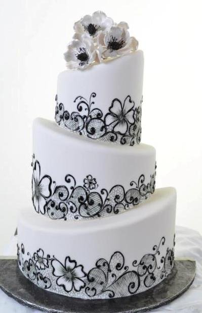 Classic good looks never go out of style, and this triple-tier of smooth white fondant serves as the perfect canvas for a lacy confection.Black floral and flourishes with intricate lace detail create a fashionable presentation for the bride and groom who want their cake to stand out with style. The use of topsy-turvy layers add just the right touch of character, while beautifully-crafted white sugar peonies crown this lovely design with panache. A truly memorable selection for any couple’s once-in-a-lifetime celebration.