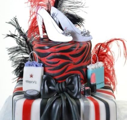 This unique creation will delight and inspire the consummate shopper!Brands galore are represented here, from Tiffany to Macy’s, from lipstick to shoes (and after all, who couldn’t use another pair of gorgeous shoes?).It’s all here, in “Shopping Spree”.Two tiers, one square, the other round, serve as the base for all these luxurious and expensive items.Red, white, and black, with just a dash of silver create an exciting, lively effect.Black and red plumes add flair, and the big flouncy black bow wraps up the entire package.