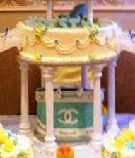 This astounding creation will be certain to elicit “Ooohs” and “Aaaahs” from one and all.Comprised of ten separate tiers, “Stairway to Paradise” is as extravagant as it is overwhelming.Each separate piece is painstakingly decorated with drapes and flowers galore, in yellow and pale blue.The ornate staircases leading from one level to the next lead the focus upward and upward, and the columns supporting the various tiers add an even more dramatic illusion of grandeur.The very top tier is the perfect size for the couple to keep, in order to partake of it on their first anniversary, as the tradition insists.This Piece de resistance may even inspire sonnets on its own merit!It is a truly spectacular selection for the most important event in the life of the bride and groom.