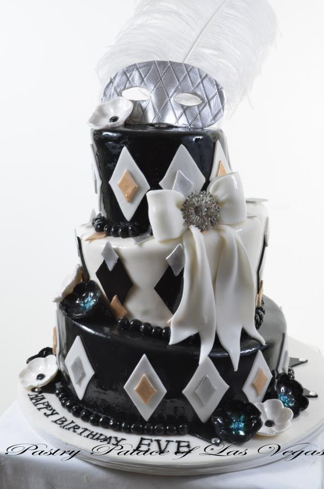 This elegant affair in classic black and white is the perfect choice for Mardi Gras, a birthday celebration or any other special occasion.Three topsy-turvy tiers, alternately iced in pristine white and shiny lacquer-black, in a Harlequinesque motif, are ringed at their bases with strands of black “pearls”.Smaller diamonds overlay the larger black and white diamonds that adorn the sides of each tier, and black and white flowers, embellished with sparkling centers add a touch of glitz and glamour.A large white bow boasts a shimmeringcrystal starburst accent, while a gleaming sliver mask, complete with large white plume, crowns this “Black & White Masked Diamonds” creation, to a “T”.