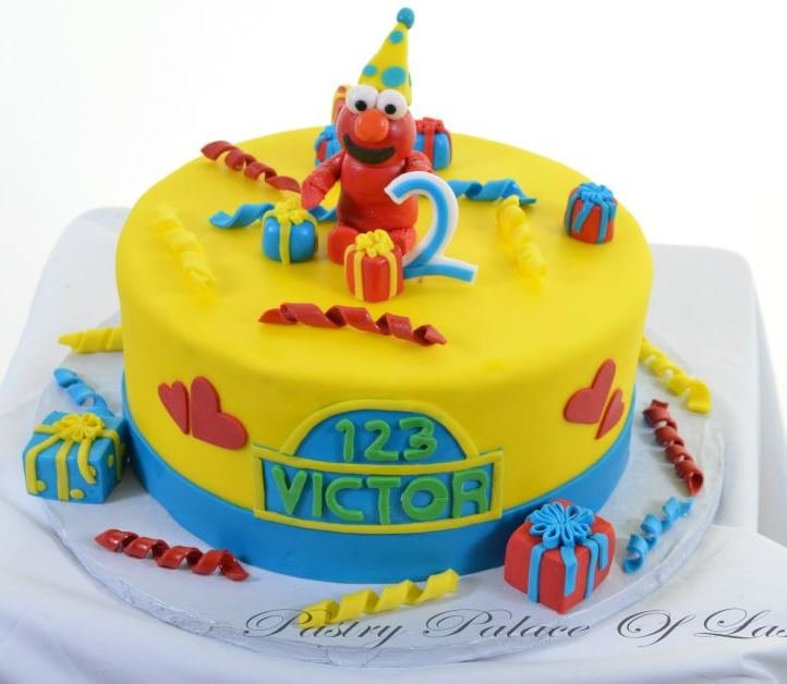 This delightful creation in primary colors depicts that favorite of children everywhere around the world:Elmo.Children have flocked to Elmo since his debut on Sesame Street in the early 1970s, but came to world-wide fame in 1996 when the “Tickle Me Elmo” toy was released.This bright yellow tier provides the cheerful backdrop on which to display red hearts, ribbon twists, and lots of birthday presents, all in red, yellow and blue.The birthday boy’s name is displayed in green, standing out from the primary-color scheme.Elmo himself sits atop the cake, presiding over the festivities, in “Elmo’s Party.”