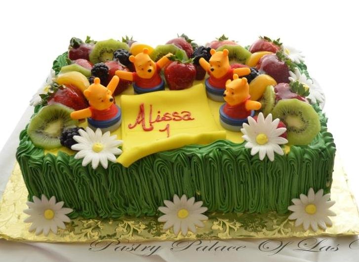 Winnie the Pooh has been a favorite among children and adults, alike, since his debut in 1926 in A.A. Milne’s first collection of stories about the anthropomorphic bear.This luscious and winning design takes a simple single square layer, dresses it up in yellow and green, and turns it into a lovely meadow, replete with tall grasses and cheerful white daisies.The top of the cake is chock-full of the most scrumptious blackberries, strawberries, and sliced kiwis, each in their own mouth-watering glaze, and accompanied by multiple “Winnie the Pooh” figures.This work is certain to charm one and all, for no one could possibly resist the bear who said to his friend Piglet, “If you live to be a hundred, I want to live to be a hundred minus one day so I never have to live without you.”