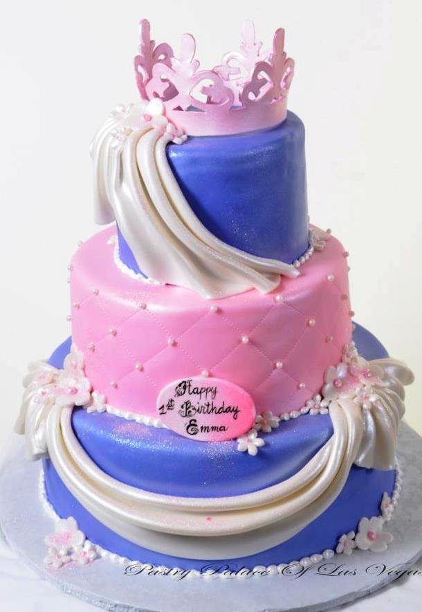 For the little princess in the family, only this three-tiered towering work of art will do!Two tiers in shimmering lavender, draped in swags of white satin, are offset by the middle tier of palest pink, in a “quilted” motif that is accented in tiny white “pearls”.Strands of pearls ring the base of each tier, and delicate white flowers of different sizes appear in strategic locations, throughout.A beautifully ornate pink crown, fit for the most royal “highness” rests atop this creation that is sure to delight any birthday girl.