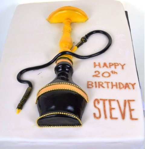 Hookahs have been in use since the 16th century, and have gained extreme popularity, in recent years.This representation is taken from the classic style and design of the ancient water pipe.The bottle protrudes from the top of a pristine white single tiered cake, with its slightly oriental accent, bold in black and yellow, with three rings of gold beads adding a splash of sparkling glitz.The black stem curves around gracefully, tempting anyone to partake.For any devotee (and apparently, Steve is one!), this unique “Hookah” creation will serve as a perfect selection for a birthday celebration.