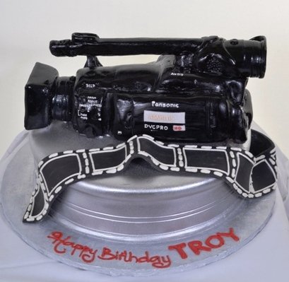 For the budding videographer, this novelty creation is a must!Any devotee will immediately recognize this Panasonic DVCPro HD professional quality model as a top-of-the-line camcorder – one to be coveted. Complete with all the expensive “bells and whistles”, this camera might sell for upwards of $15,000!While this one is not nearly so dear, its impeccable detail makes it seem as if you might be able to pick it up and utilize it to record the festivities for posterity.The camcorder is perched atop a silver tier that emulates a canister containing film, a wisp of which has escaped and draped itself over the can.This “Video Camera” is sure to elicit admiration, and end up appearing in numerous other videos!