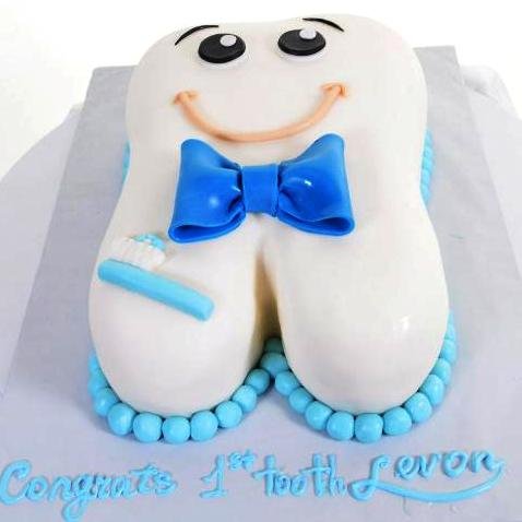 When the first tooth shows up, is it more exciting for mom and dad, or for the ‘tooth recipient’? It’s hard to say, because it’s such a memorable landmark for a child’s growth – it’s tough NOT to celebrate the event!This cake, as shiny as white enamel, is playfully shaped as a baby’s firth tooth – complete with smiling face, a big bow collar, and an image of Baby’s First Toothbrush, too! (Learn those good habits early!)A fun and festive way for the whole family to rejoice.