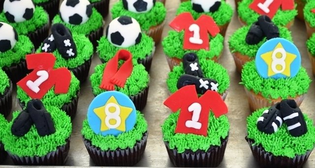 Soccer (or “football”, as it is known in Europe) has become the second most popular participatory sport in the U.S., in the last five decades, behind only softball/baseball. Over 13 million children and adults in the United States play soccer today. It stands to reason then, that as a natural outcome of this popularity, these yummy “Sports Cupcakes” would be a sure-fire hit! These particular specimens are first decorated with a spring green, grass-like frosting, and then topped with miniature facsimiles of soccer jerseys, sporty shoes, team badges, and those unmistakable soccer balls. Each jersey is numbered, and the tiny soccer shoes have been meticulously rendered in different patterns of laces and stripes. The badges sport the numeral “8” in recognition of victories on the field, and the Lilliputian soccer balls are simply too cute! What a perfect confection for an end of the year celebration!