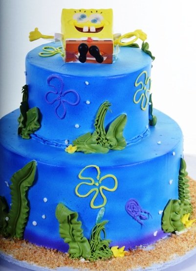 Since making his debut on Nickelodeon in May of 1999, “SpongeBob” Squarepants has been a success on an enormous scale. It currently Nickelodeon’s longest-running cartoon, and SpongeBob is one of the most popular characters in children’s television. Living in his underwater hometown of Bikini Bottom (also known as Downtown), SpongeBob pals around with his friends, enjoying is life, just like anyone else. Today, he’s perched on top of a two-tiered birthday cake, all decked out in variegated shades of blue, and full of the common flora and fauna of the ocean. Replete with bubbles racing to the surface, SpongeBob is ready to celebrate the occasion!