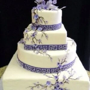 A classic Greek geometric design in silver, on ultra-rich deep purple, borders each tier in this Hellenic masterpiece that consists of four tiers:two round and two square.This glorious tower, attired in purest snow white appears to be reaching toward Olympus, the very seat of the gods.I’m sure they would all approve, from Zeus all the way down the line.Tendrils of blossoming vines wind up and around the tower, creating a dramatic effect highlighted with exquisite lavender blooms.A pair of petite birds, in matching lavender tint, crowns this elegant statement, amid a clutch of larger flowers, emanating from the delicate climbing branches.This top tier of the work can be easily retained by bride and groom for the occasion of their first anniversary.This piece de resistance will certainly be posing for the paparazzi as it awaits to be cut!