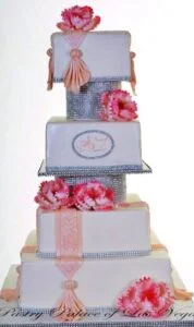 This towering work of art is an absolute delight to behold. Four grand square tiers comprise this statement in refinement. Each tier is enveloped in the most simple and classic bridal-white. The base of each tier is then meticulously edged with a glittering crystal ribbon. Two round platforms, also encrusted with crystalline rhinestones elevate the top two tiers to even grander heights and provide additional drama to the effect. Broad embroidered “ribbons” in pale pink, culminate in graceful fabric “tassels”, enriching the piece with a dash of understated color. Extraordinarily large peonies, also tinted with variegated shades of pink add the finishing touch of glamour. Stunning, graceful, and impressive are words that only begin to describe this design.