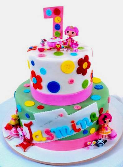 “Button, button; who’s got the button?” There are plenty to spare, here. Two tiers, one in mint green, the other in purest white, form the structure of this design. Each tier is surrounded by a broad band of bright and cheery pink, and adorned with buttons in a virtual rainbow of colors and a wide variety of sizes. The numeral perched on the top of the cake is intended to look like fabric and displays detailed stitching around the edges. The name of the birthday girl appears to have been constructed of letters cut from felt, and meticulously glued onto a swatch of fabric that has a “pinked” edge, then fastened onto the cake with a “straight pin.” Four charming little “dolls” are in attendance, with little white mice that look like they came directly from sewing together Cinderella’s ball gown. This is a very special design for an exceptional little girl!