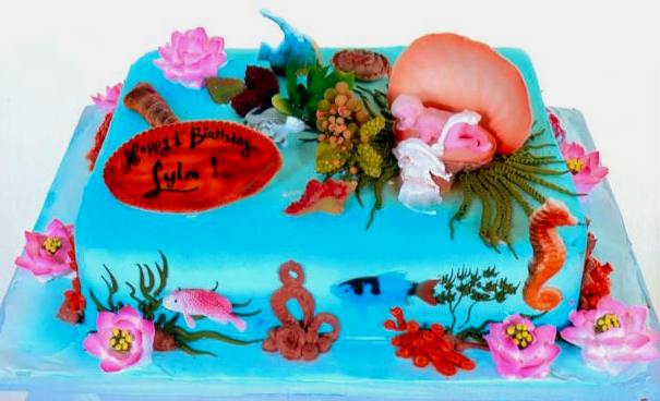 This peaceful underwater scene brings a touch of serenity to what might ordinarily be a stressful occasion. The pressure of a first birthday party has the capacity to undermine the composure of even the most assured parents, but this tranquil scene will serve as a reminder of the joys of watching Lyla grow and mature, day-by-day – sometimes even hour-by-hour. The single tier, iced in calming shades of blue is full of graceful and colorful flora and fauna of the sea, quietly going about their business as the baby sleeps in the protection of a giant shell. It’s said that “from water, all life begins”; this work, then, is perfectly suited to the occasion of a celebration of Lyla’s appearance on the scene, one year ago.