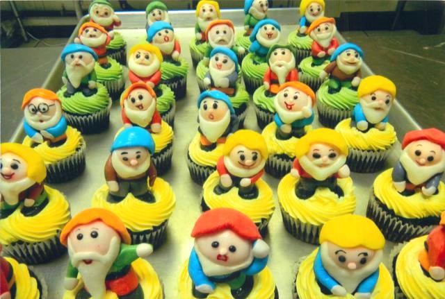 It’s Off To Work We Go….!You can just hear these little guys – the Seven Dwarfs of Snow White fame – singing their trademark song as they head off to their daily routine.Bashful, Doc, Sneezy, Sleepy, Dopey, Grumpy and Happy are all molded and featured atop their very own cupcake, ringed in bright green or yellow icing shells and waiting to join the lucky one’s birthday party. Accompany these tiny characters with a cake that shows all the beauty of Snow White herself – and you have the makings for a Disney event of massive proportions!