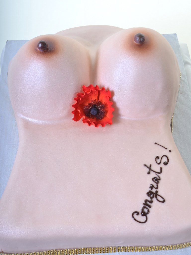 X-rated, or these days, actually, really just “R” – but definitely not a cake for kids! Simplicity itself (if you’re taking nature at her word) – this female torso has three simple redeeming features: A message of congratulations, a striking red and realistic sugar poppy, and a pair of breasts – complete with nipples (and it must be cold in here, if you catch our drift). Take your pick on what type of event to choose this design to complement – Bachelor party, Grooms cake, a coming-of-age birthday, or even as a gag gift – whatever the reason, it’s always nice to know that if you are in search of a ‘boob cake’ – you can absolutely get one for your event!