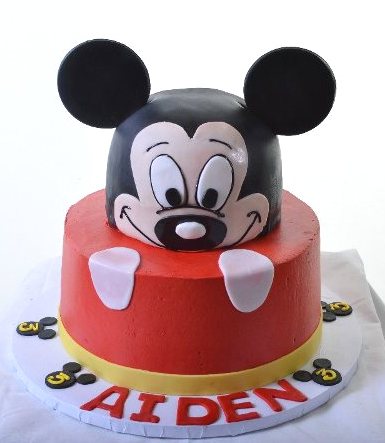 Appearing here is one of the planet’s most well-known characters – M-I-C-K-E-Y Mouse, seemingly popping up out of the base of this round cake, just enough to see the whites of his eyes . . . and his nose, and his smile, and okay, those famous ears, too. The two white spots we’re all used to seeing on his bright red shorts almost give the impression that his white-gloved hands are ready to pull him up out of this cake to join in all the birthday festivities himself. It’s a fabulous way to celebrate for a kid (although we know plenty of adults who still adore Mickey today!) – with his famous silhouette placed around the base of the cake happily proclaiming which birthday year is being celebrated – alongside their name in bright red cutout fondant, too. How can any kid resist?
