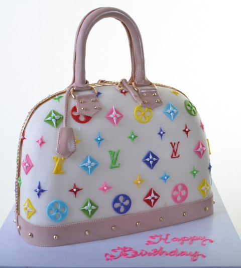 One can hardly go wrong with Louis Vuitton. Louis Vuitton is one of the world’s leading international fashion houses; founded in 1854, the label’s LV monogram appears on most of its products, ranging from luxury trunks and leather goods to ready-to-wear, shoes, watches, jewelry, accessories, sunglasses, and books. Of late, the ladies’ handbags have become “the fashion accessory”, and can be seen virtually everywhere. This one has (“Beverly”) all the earmarks of the most popular models. Neutral colors form the background, and colorful variations of the LV logos add color and a carefree, breezy attitude. The detail of the stitching and the brass hardware are impeccable and reflect the craftsmanship of the brand, succinctly. I suspect that the guest of honor will not even wish this beautiful piece to be cut!