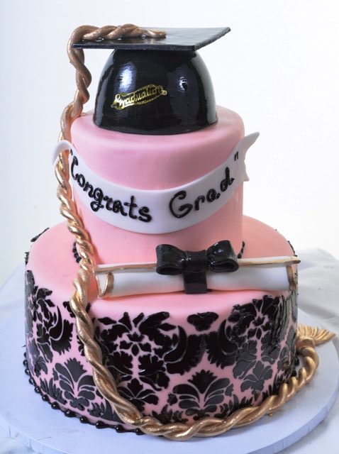 Commencement signifies not only the completion of a level of education, but the beginning of the adventure of life, for most young people – a chance to fly under their own power. For that special grad, this “study” in elegance and grace will likely elicit admiration and appreciation. Two tiers in the most refined shade of pink serve as the foundation, each ringed with a strand of shiny black beads. A stunning damask pattern in lacquer black ornaments the lower tier, while a black graduation mortarboard rests upon the top tier. A silky cord, denoting rank or achievement drapes down the side, and a rolled-up “sheepskin” rests on the bottom layer, tied up in a dainty and shiny black bow.