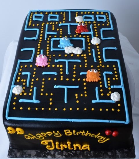 Immensely popular from its original release in 1980 to the present day, Pac-Man is considered one of the classics of the medium, virtually synonymous with video games, and an icon of 1980s popular culture. A departure from the games of the time which mostly consisted of “shooting” at aliens, or other villains, it is often credited with being a landmark in video game history, and is among the most famous arcade games of all time.Here we see a single black rectangular tier creating a detailed representation of the classic black screen against which the maze appears. The yellow “power pellets” and the four “goblins” who try to catch Pac-Man are all here, and Pac-Man is ready to begin another attempt at immortality. This themed birthday bash will certainly be a memorable one for Tirina and all her friends.