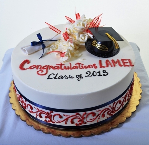 They’ve made it through the necessary courses – whether it was college, high school or even kindergarten – and that is reason enough to throw a party! This single round tier of white whipped cream icing is the perfect choice for an intimate gathering, and yet striking in both its design and simplicity. The outside surface is ringed with two narrow black ribbons, between which is a hand-piped red scroll design that pops from the surface in both color and texture. A small bouquet of cream-colored roses, spiked with red ribbon tufts adorns the top, along with a rolled and tied diploma, graduation hat, and the appropriate hand-piped Congratulations. Artistry in cake, indeed.