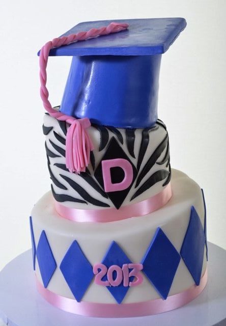 Just like every student has a personality of their own – there’s no reason that when they finally get to celebrate their passage from school to ‘real world’ they shouldn’t get to show their own sense of style. This topsy-turvy design is a perfect example. Three tiers high, each with a bit of character all its own. On the bottom, bright blue Harlequin diamonds adorn the face, layered with a fondant representation of the graduate’s class year. The center tier features bold black zebra stripes, with a black diamond and single initial showing. And the top tier is – what else? A bright blue mortarboard cap complete with braided pink tassel. Add some coordinating pink ribbons surrounding the bottom two tiers, and you have the makings for a fun and quirky graduation event.