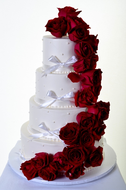 What other title would suffice for this gorgeous work but “Ravishing Roses“? Nothing says love and romance in quite the same way as red roses, and this design contains a most breathtaking number of them! This gleaming, glistening tower of white, four tiers high, could stand on its own, with its understated white beaded trim and simple, but elegant, white satin bows. But add this spectacularly abundant display of huge, fresh, deep-red roses, spilling down the front in a riotous cascade, and you have “ravishing” covered. This is a design that can truly deliver for any occasion – wedding, birthday of a most beloved person, anniversary, congratulations of any achievement – you name it! This is a model that will inspire a cacophony of “ooohs” and “aaaahs” wherever it takes center stage.