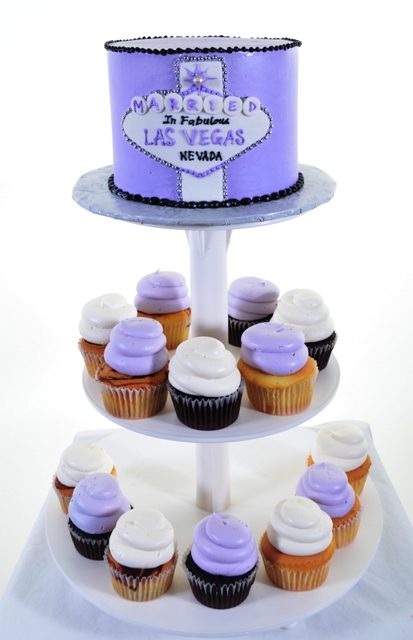 Nothing makes a party more fun and casually interactive than cupcakes, and that’s just the feeling this happy couple wanted to impart for their wedding celebration. An attractive cupcake tower built to hold a light purple and white color scheme, the top of the tower showcasing a single round cake tier that includes the highly recognizable Las Vegas sign – and two lower tiers that feature multi-flavor cupcakes in alternating colors, piled high with a luscious and light whipped cream icing. Perfect for weddings, birthdays, or really just any type of celebration you have planned. This is one cake presentation that won’t have any leftovers to clean up!