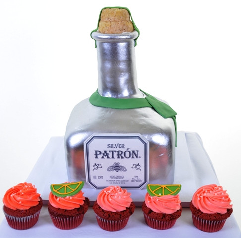 Oh – there’s those quirky little tequila cupcakes again (from our Cupcakes #1396) — showing up in the right place at the right time and with their new best friend – a bottle of Silver Patron. What’s more – they brought the salt and the lime with them, too!The star of this plateau is the hand-sculpted cake ‘bottle’ – towering above the friendly lime-and-salt cupcakes. With it’s realistic label, silver finish, and even the taped cork at the top of the bottle, your guests will be hard-pressed to believe this centerpiece is for eating and not drinking. But go ahead – have them ‘pour’ a stiff one, salt their hand and squeeze the lime anyway. It’s all good!