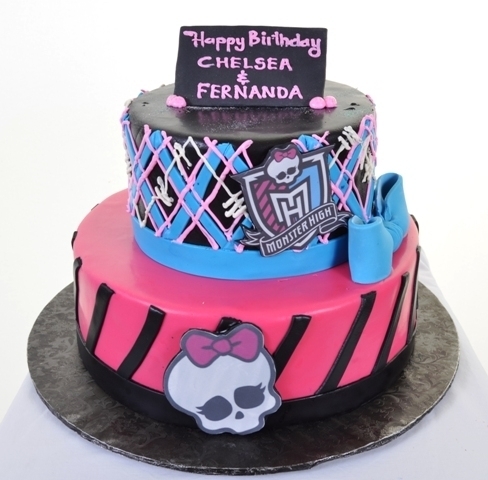 Is your pre-teen a fan of Monster High? If so – then you need look no further than this cake. It’s all she needs to ensure her party is a skull-smashing success! Whatever her favorite characters – Frankie, Clawdeen, or Draculaura – the famed Monster High school logo is proof that this is the place to be. Two round tiers are shown here, the bottom in a bright pink smooth and shiny fondant, trimmed with slanted black fondant stripes and also around the base. The top starts with a black base and explodes in the familiar pink, blue and white plaid-like design, all captured with a blue ribbon and bow, school crests and a Happy Birthday sign on top. If you know what’s good for you, the packages surrounding this fun cake will include her favorite dolls, too!