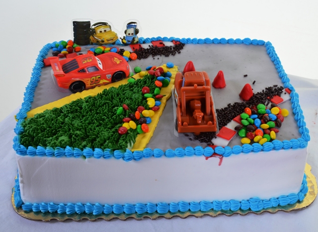 This novelty design takes its cue from “Cars”, the sensational Pixar/Disney movie franchise that debuted in 2006.Set in a world populated entirely by anthropomorphic cars and other vehicles, it features voices by Paul Newman, Owen Wilson, Larry the Cable Guy, Bonnie Hunt, Tony Shalhoub, and Cheech Marin, to name just a few. Children around the world were absolutely taken in by these movies and came to consider the characters as “friends”. This single tier, expertly decorated to depict the fictional “Los Angeles International Speedway” in California, and it looks like #95 (aka “Lightning McQueen”) is ready for a pit stop! His crew stands ready to render whatever services are necessary to get him back on the race track and on his way. His trusty friend, Tow Mater is standing by, as well. “Cars’ Track” is sure to delight children and adults alike, for any occasion.