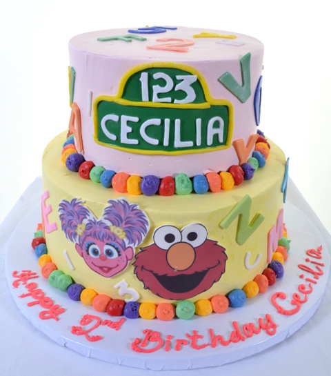 Sesame Street is a perennial favorite among the “younger set”, and has been since it debuted on Public Television in 1969. This design contains all the elements that have made Sesame Street so popular – letters, numbers, and colors. The two round tiers, in pastel colors, are accompanied by hand-drawn block letters and numbers, and each tier is decked out in a strand of large beads in a rainbow of cheerful colors. Abby Cadabby (a 3-year-old fairy in training) and Elmo (of “Tickle Me Elmo” fame) are both in attendance to get this party off to a great start. Any toddler will be delighted by “Sesame Street Special” and it will appeal to all the little guests, too!