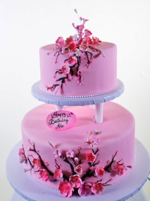 Cherry blossoms have long been considered an enduring metaphor for the ephemeral nature of life. Primarily symbolizing the beginning of spring, they lift the spirit and beautify the landscape. In this design, we have two tiers in a shade of pink complementary to the blossoms on their stems. The upper tier is supported by columns and both tiers are decoratively edged with a single strand of luminous tiny “pearls.” The artistic rendering of the delicate blooms is nothing short of magical. Each blossom is hand-tinted to captivate all the myriad shades of pink, and each stem is studded with blooms in various stages of the flowering process. In this iteration, this piece serves as a centerpiece for a birthday celebration, but it is clear that it would bring beauty and elegance to any type of festivity. “Cherry Blossoms for You” has a charm and grace all its own.