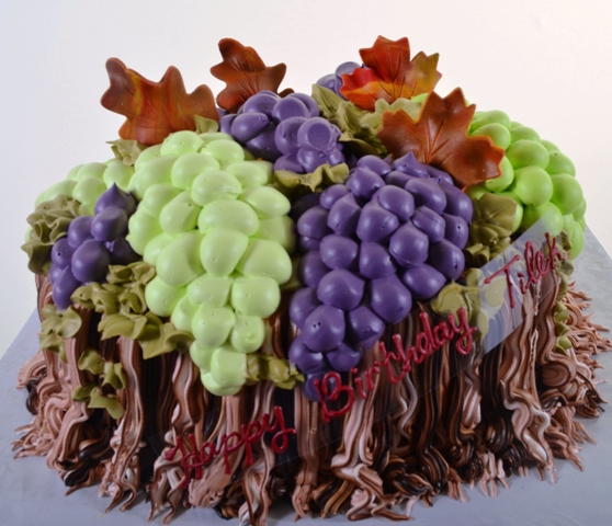 The grape vine has long been associated with abundance and prosperity. This unique novelty design captures all the fruitfulness and fertility of harvest time, flawlessly. A single round tier is decorated to simulate grapevines growing up towards the sun, where they can flourish and ripen. Whether they are harvested for sustenance in the form of food or drink, it is certain they will be cause for celebrating a bountiful reaping. Large clusters of white and red grapes rest atop the cake, accompanied by grape leaves and curling tendrils on the vines. For the connoisseur of grapes or wine, or to symbolize wishes for a year of overflowing largesse, “The Vineyard” will convey the message.