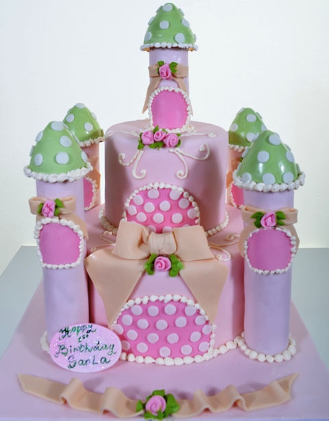 This charming design is a little girl’s dream! A veritable fairyland chateau, complete with towers, all that is missing is Rapunzel, Snow White, or Aurora. Two round tiers in fairy pink are edged at the base, and at the front gates with hand-piped white beads. White polka dots are everywhere, decorating the front gates and on the pale green tops of the five towers. Each tower window is also edged with the white beads, and charming little dark pink rosebuds embellish decorative velvet ribbons. “Polka Dot Chateau” will delight and excite any young little princess celebrating a birthday. Don’t miss the chance to make your little one feel extra special on her day!