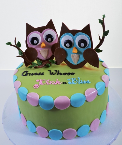 This delightful piece features a single round tier, iced in beautiful spring green. Place on the edge of the top, and around the base of the cake are alternating discs in pink and blue. Perched atop the tier on delicate branches are two owls, also in pink and blue. Owls have long been associated with wisdom. This link goes back at least as far as Ancient Greece, where Athens, noted for art and scholarship, and Athena, Athens’ patron goddess and the goddess of wisdom, had the owl as a symbol. This design could serve as the centerpiece for any occasion where a blessing of wisdom might be invoked. A child starting school, or anyone facing new challenges, will appreciate this good omen.