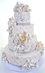 This work of art succeeds on every level. Four round tiers in gleaming white form a veritable monument of wedding cakery. Each layer is encircled by a crystal band at the base, accenting and adding sparkle to this design. Two tiers are embossed in a quilted-diamond motif, with tiny silver beads discreetly marking the points of the diamond shapes. The remaining two tiers are embellished with glorious hand-drawn flourishes and curlicues executed in shiny silver. Clutches and sprays of white roses, dusted with a touch of silver, are placed strategically around the piece and oversized peonies, executed in a softer white, contribute the perfect touch of romance and warmth. “Silver and White” is an imposing and regal centerpiece for any wedding. It can be yours!