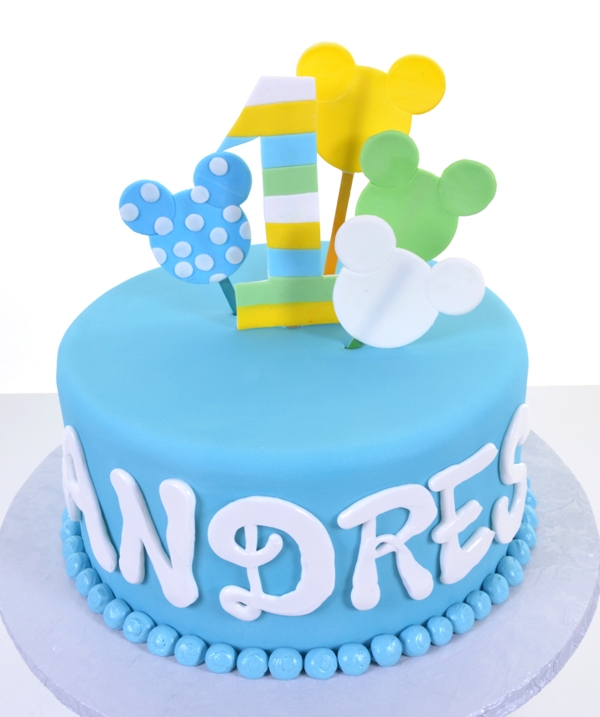 This simple and charming work consists of a single round tier, in an elegant shade of blue. Large blue beads ornament the base of the cake, and the celebrant’s name is hand-drawn in a free-style font, in very large letters, on the side of the cake. On the top are 4 silhouettes that will be instantly recognizable to any child as being representations of Mickey Mouse. Created in 1928 by Walt Disney, Mickey Mouse is one of the most recognizable cartoon characters in the world. Being the official mascot of the Walt Disney company certainly doesn’t hurt. There are few people, children or adult, who are not familiar with Mickey and all his friends, including his girlfriend Minnie. These four silhouettes with the trademark large ears might be a hint regarding a birthday present consisting of a trip to Disneyland, or Disney World. The large numeral “1” is done up in the stripes, utilizing all the colors used in this design. Disneyland is known as “the happiest place on earth”, and “Visions of Mickey” will bring some of that cheer to this birthday event.