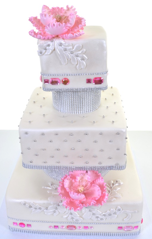This fabulous design is sure to impress! Three square tiers, in a white satin finish, are separated and elevated by short, but dazzling columns. The base of each tier is also wrapped up in a glittering crystal ribbon. On the base and top tiers, an additional strand of crystal creates a border to an expanse of white that is studded with stunning pink gems of different shapes and sizes. The middle tier is decked out in dozens of tiny silver beads, bringing their own luminous shine. Beautiful floral artwork on the bottom and top tiers, also accented with silver beads, stunningly complements the exquisitely large pink peonies. “Pink, White, and Sparkle” is a traditional design that’s been brought to a new level of glamorous appeal. A magnificent centerpiece, it simply cannot miss!