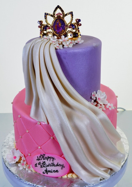 Two lavish round tiers form the infrastructure of this piece. The bottom layer is iced in “fairy” pink, and embossed in a quilted-diamond motif. Tiny luminous pink beads dot each corner of the diamond shapes. The top layer is done up in a smooth delicate lavender. A luxurious drape of ivory satin sweeps down from the top of the piece to the bottom, in graceful fashion. Tiny white flowerets with miniscule pink bead centers adorn the cake, in several locations. On the top of the design, a bed of these fragile flowers supports a stunning golden crown. This royal headpiece is studded with amethyst-colored stones, and an image of Rapunzel with her magical hair draped over her arm. Disney Princesses have been favorites of little girls since the 1937, when Snow White and the Seven Dwarfs, Disney’s first full-length animated feature, was released to world-wide acclaim. The parade of Disney Princesses seems to be endless, and at this point, has given every little girl someone they can identify with. “Tangled”, a Disney re-telling of the story of Rapunzel, was immensely popular, and Amina is sure to be in her glory when she sees “Lavender and Pink.”