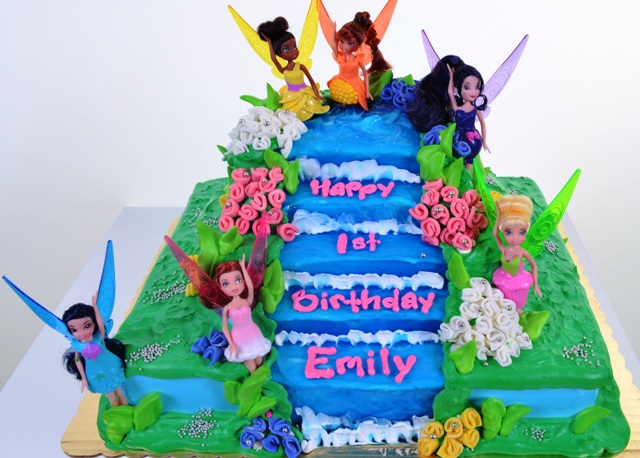 What an enchanting display; a lush glade in the springtime is the setting. Rich green is set off brilliantly with thickets of charming little flowers in blue, white, pink, lavender, and yellow. Centered in the glade is an idyllic staircase in shades of blue, leading up to the fairy habitat. These ethereal little pixies, all with magical wings to match their attire, and each with her own unique supernatural power, have decided to descend from their mystical woodland realm to assist in making Emily’s birthday a most special one. Silver fairy dust from the beating of their wings has fallen to earth, and it’s said that anyone who manages to capture some in their palm (or ingest some, in the form of a piece of this stunning cake) will have a wish granted. That should be reason enough to dig in to this delightful work that we’ve named “Fairy Princesses.”