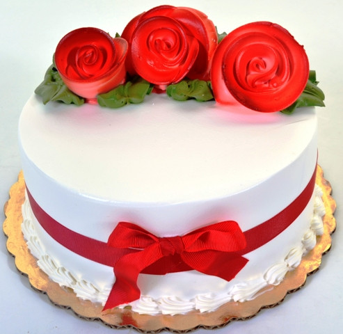 One of our favorites, this design is well on its way to becoming a “classic.” There is really no way to transcend simplicity. “Trio of Red Roses” is the epitome of timeless grace and elegance. A single white tier is edged at the base with a frilly combed “ruffle” effect. A brilliant-red grosgrain ribbon is tied around the tier and finished off in a charming bow. Enough cannot be said regarding the significance of roses. They are the most coveted and symbolic of all flowers, and they convey sentiments from true friendship (yellow) to romantic and lasting love (red). Crowning this affair is a clutch of three improbably stunning hand-formed roses, artfully and meticulously hand-tinted using shades from deepest pink to perfect red. These beauties are cushioned by a bed of delicate, spring-green leaves, which complement the color of the blooms flawlessly. For birthday, Valentine’s Day, engagement party, or even for an intimate wedding, this work of art is up to the task!