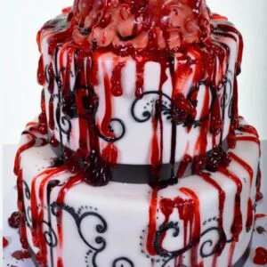 I know what you’re thinking: “This is a WEDDING cake??!!?” Well, the answer is, “Of course it is! Zombies get married too!” At first glance, this might produce a shiver of horror, but if you have any imagination, and just the right sense of humor, you’ll catch our drift! Our designers begin with two beautiful snow white round tiers. A broad black satin ribbon edges the base of each of them. Then our artists go to work, meticulously applying intricate artwork by hand to fully decorate the side of each tier. Then they really go to work! A third (ahem) tier is hand-molded and formed into the likeness of the human brain (I hear all you zombies out there saying “Yum!”), with all the folds and wrinkles that indicate intelligence. To enhance the appearance that this is a freshly acquired item, the “blood” is allowed to drip down the length of the cake and splatter where it may. There’s no brain like a fresh one, they say. The willingness to share this delicacy with all the guests is a mark of the esteem in which they are held. For the Halloween-themed wedding, or simply for the couple who are avid fans of “The Walking Dead”, or any number of any other cultural phenomena linked to the current “zombie” craze, “Bloody Zombie Brain” is the only choice!