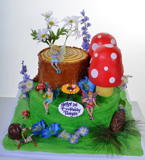 This absolutely enchanting design is chock full of the colors, plants, and creatures that any young child would expect to see on a “Visit to Fairy Land.” The setting is a magical glen, hidden from view, but readily found by the most curious. A raised mound is covered in lush grass and soft moss. An old tree stump, complete with age rings, is already sprouting large daisies, and is the perfect resting place for a fairy who might be tiring. Two enormous mushrooms in bright red, and decorated with white polka dots, are nestled near the tree stump. Morning glories and lavender stock are seemingly blossoming helter-skelter. Pine cones and clumps of long needles add texture and variety. A small sprite rides on the back of a large chocolate snail, and several other fairies hover nearby. An upturned sunflower serves as a tea table. Expert detail is evident everywhere in this design that is burgeoning with life and whimsicality. What a charming work this is, for any birthday.