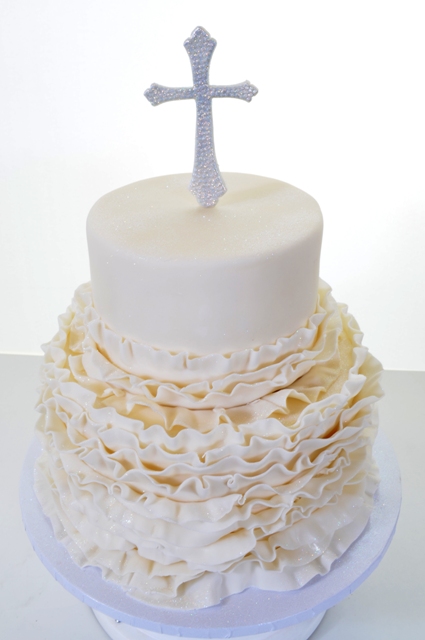 This unique design reflects all the sanctity and purity to be wished for in a Christening or First Communion celebration. Such religious rites demand honor and reverence, and this design provides that, along with beauty and grace. This piece, in purest white, is comprised of two round tiers. The top tier is smoothly iced to perfection. The base tier is an absolute marvel – row after consecutive row of elegantly hand-formed “ruffle” creates a stunning, towering spiral of delicate frills. There are so many of them, they overlap in grand style. A Byzantine-style cross, inlaid with hundreds of sparkling rhinestones takes center stage atop the cake, and stands as a reminder of the solemnity of the occasion. But that does not detract from the reality that this is an event to be celebrated; an occasion for joy. “White Ruffles” is everything you would wish for, whether Christening or First Communion.