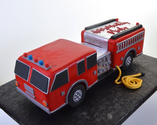Little boys and girls, alike, dream of riding on a “Big Red Firetruck!” What could be more exciting? This one is hand–molded, and perfectly constructed, in every sense. The red and blue warning lights on top, the ladders along the sides, the wheels and rims, are all created in exacting detail. The chrome trim adds shine and you can almost hear the sirens blaring! A long yellow fire hose, coiled up alongside the truck means that the firemen have arrived at their destination and are ready for action. For any youngster with a fascination with fire trucks, or the desire to one day become a brave fire fighter, this work will serve admirably as the centerpiece for a birthday celebration. So life-like that it’s hard to believe that underneath all that shiny red “paint” and “chrome”, there is some awesomely delicious cake waiting to be eaten, from top to bottom, this novelty design is a sure-fire winner!