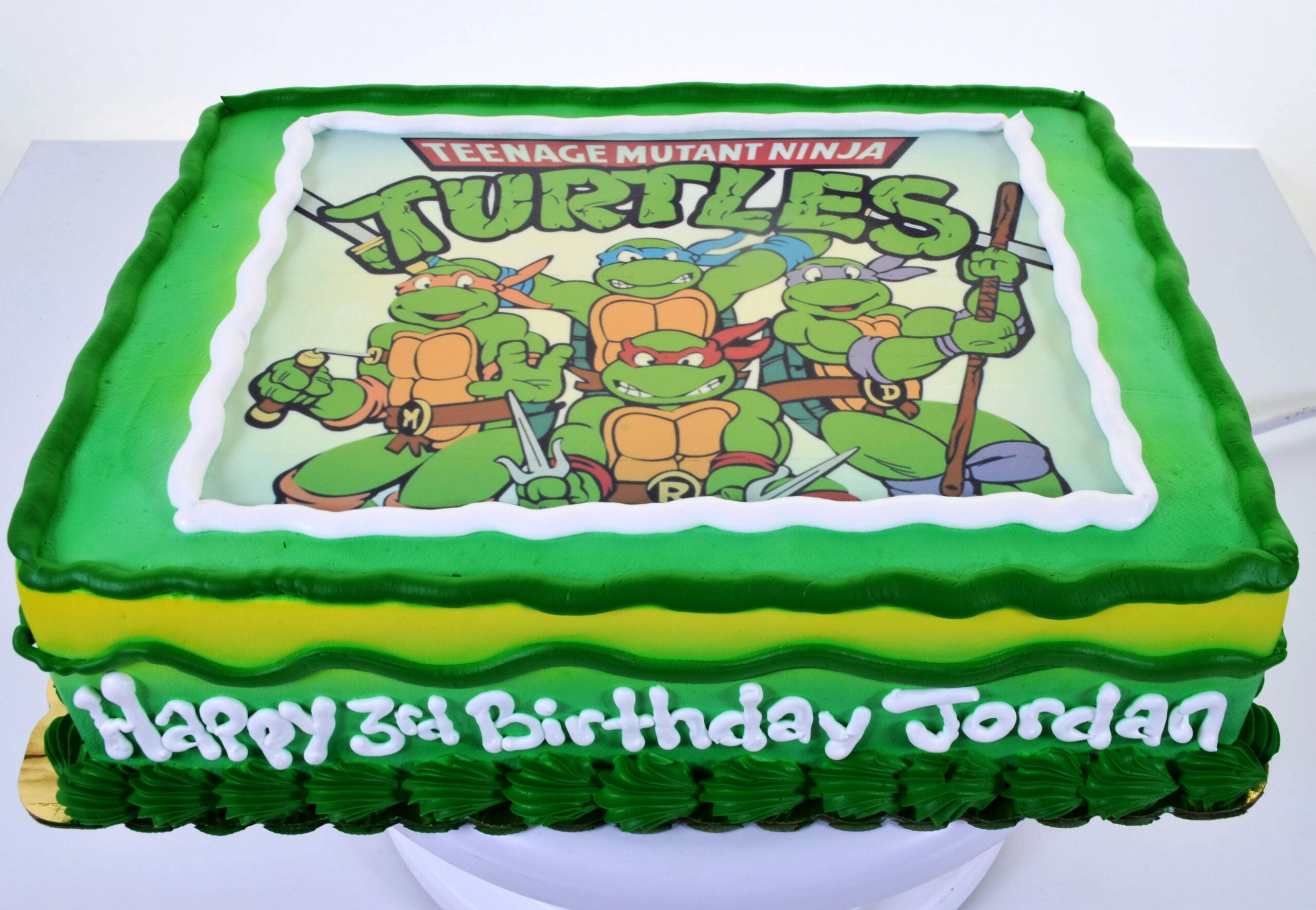 The popularity of these perennial favorites seems never to fade. Debuting in 1984, in an American comic book, published in Dover, New Hampshire, this fictional team of four teenageanthropomorphicturtles, named after fourRenaissanceartists, was trained by their anthropomorphic ratsenseiin the art ofninjutsu. From their home in the storm sewers ofNew York City, they battle petty criminals, evil overlords, mutated animals, andalien invaderswhile attempting to remain isolated from society. The comics are still published, and there is even talk of reviving the animated TV series. This work has, at its center, a reproduction of one of their most iconic photos. Leonardo, Donatello, Michaelangelo, and Raphael are all here, to with Jordan a very happy third birthday. He will, no doubt, be completely thrilled! (And so will any adult guests, who are still – maybe even secretly – fans!)