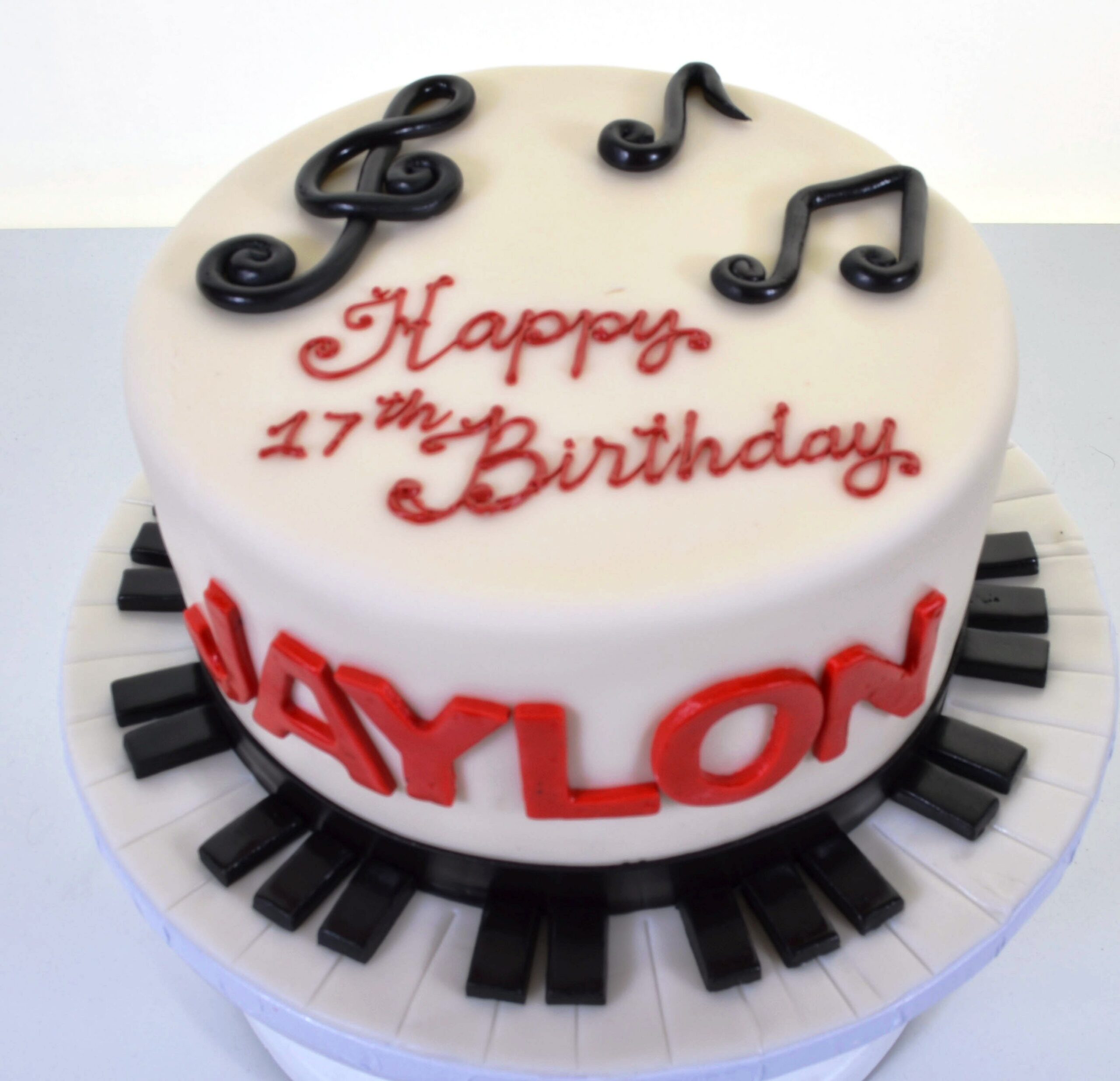 This little number in basic black and white, or perhaps “ebony and ivory”, is an ideal selection for the budding pianist. This simple round tier in white has something a little special around its base. A piano keyboard wraps around the entire base, up against a wide ribbon of black satin that looks like the backboard of a Baby Grand piano. A treble clef and a few scattered hand-painted musical notes adorn the top surface. A birthday greeting in red script declares the occasion for the gathering, and bright red block letters identify the celebrant’s name. Jaylon may be just a piano student, currently, but it’s possible that a great talent exists there that could result in a lifetime career – or perhaps simply a life-long love of music. Either way, we’ve got this one covered for you!