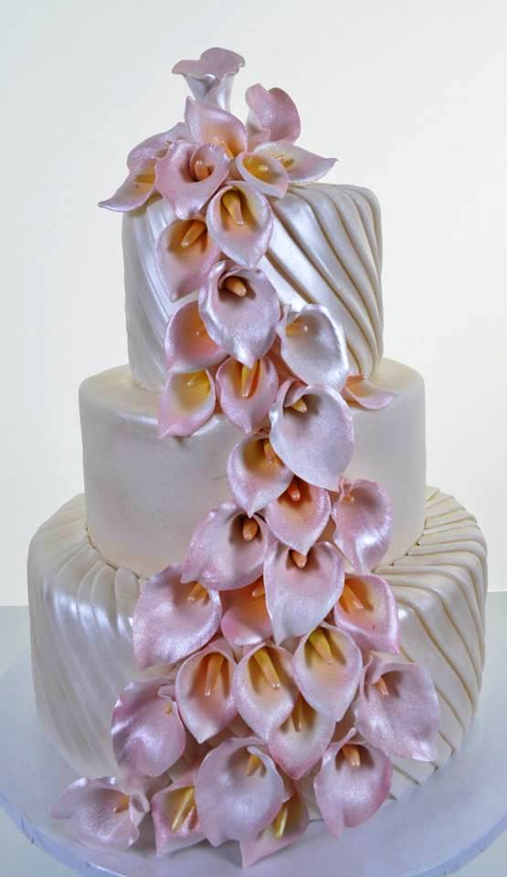 Traditionally, the calla lily has been associated with purity, divinity, and marital bliss. They also connote youth and rebirth. The name is derived from a Greek word meaning “beauty”, and it’s simple to understand why. This breathtaking affair is sure to take center stage at any wedding reception. Three majestic round tiers are covered in an ivory with a satin sheen that absolutely glistens. Two of these tiers are embellished with a motif of meticulously folded “pleats”, which add texture and drama. The focal point of this work, however, is the staggering wealth of perfectly formed “Calla Lilies” which tumbles down from the crown of the top tier, in a graceful cascade. There are literally dozens of these stunning blooms, each one artistically tinted a pale pink; one might even call it an “embarrassment of riches!” What an impression this “magnum opus” of cakery will make at your wedding!