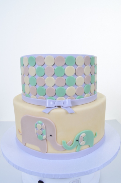 This piece is a study in muted, gentle color and design. The overall feeling conveyed here is one of tenderness, compassion, softness, and love. The two tiers are iced in a pale lavender, and a softly golden shade of yellow, respectively. The dots of ivory, mauve, and soft green add a playful air, and the lavender ribbon bands around each tier pull the color scheme together. The focal point is the mother and baby elephants, both with ears that display the “dotted” motif, and their trunks are touching one another in trust and love. Since ancient times, elephants have been highly regarded for their strength, wisdom, and loyalty. They are fiercely protective of their young, as anyone who has had the bad luck to get between a mother elephant and her calf can confirm. “Baby Elephant” is a lovely, meaningful selection for any baby shower, or “Welcome Home, Baby” celebration, or even for a juvenile birthday event.